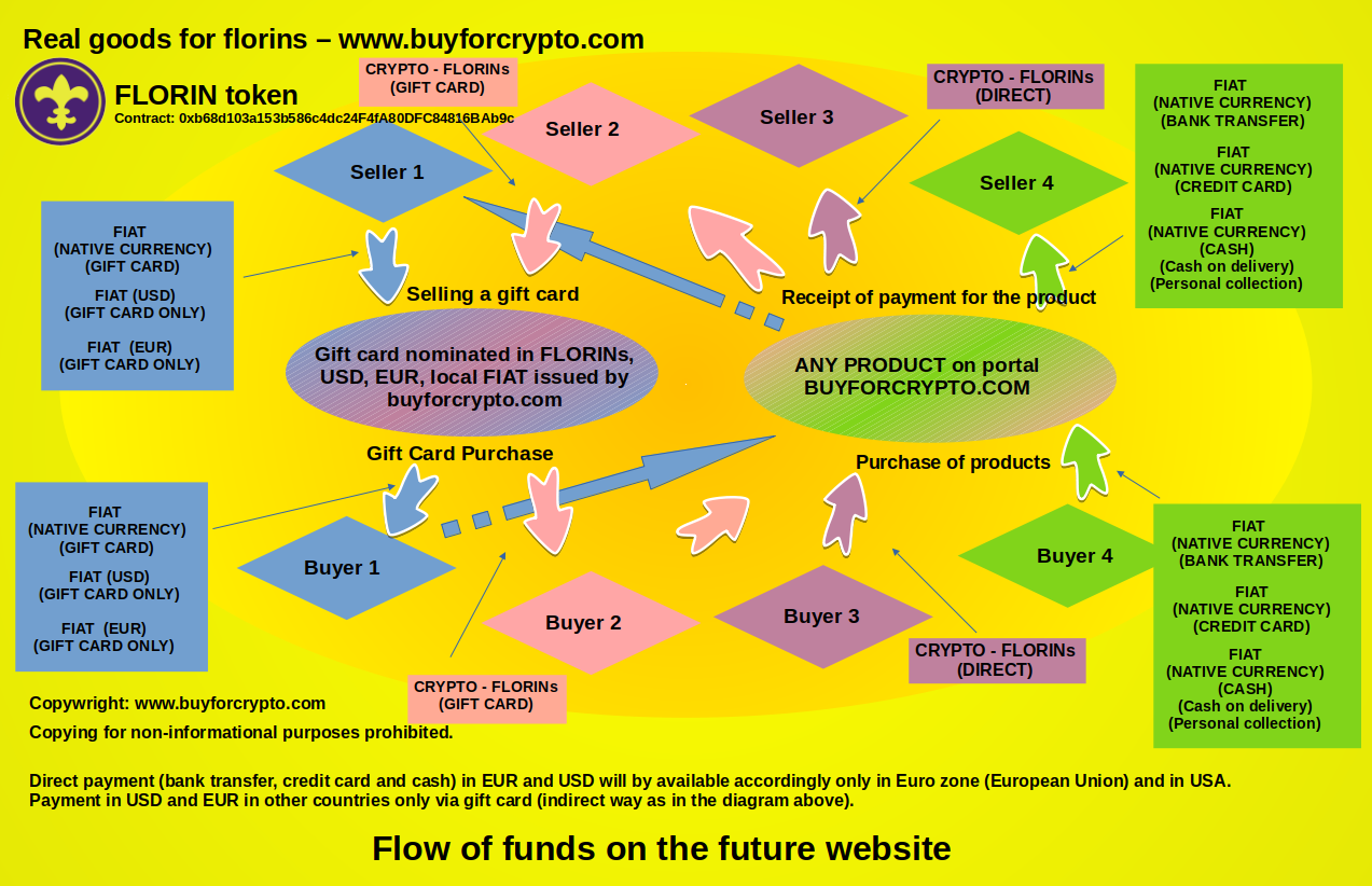 As not all sellers will accept payment in FLORINs from the beginning of their adventures with buyforcrypto.com, the portal will sell the FLORINs owners gift cards in the currency of the listed items. Each seller will have a choice in what currency he lists the goods in. It will be USD, EUR or any other national currency. And with use of gift cards buyers will be able to buy items issued in any FIAT. In this case, it will be possible for sellers to resell the gift cards to the company operating the buyforcrypto.com portal.